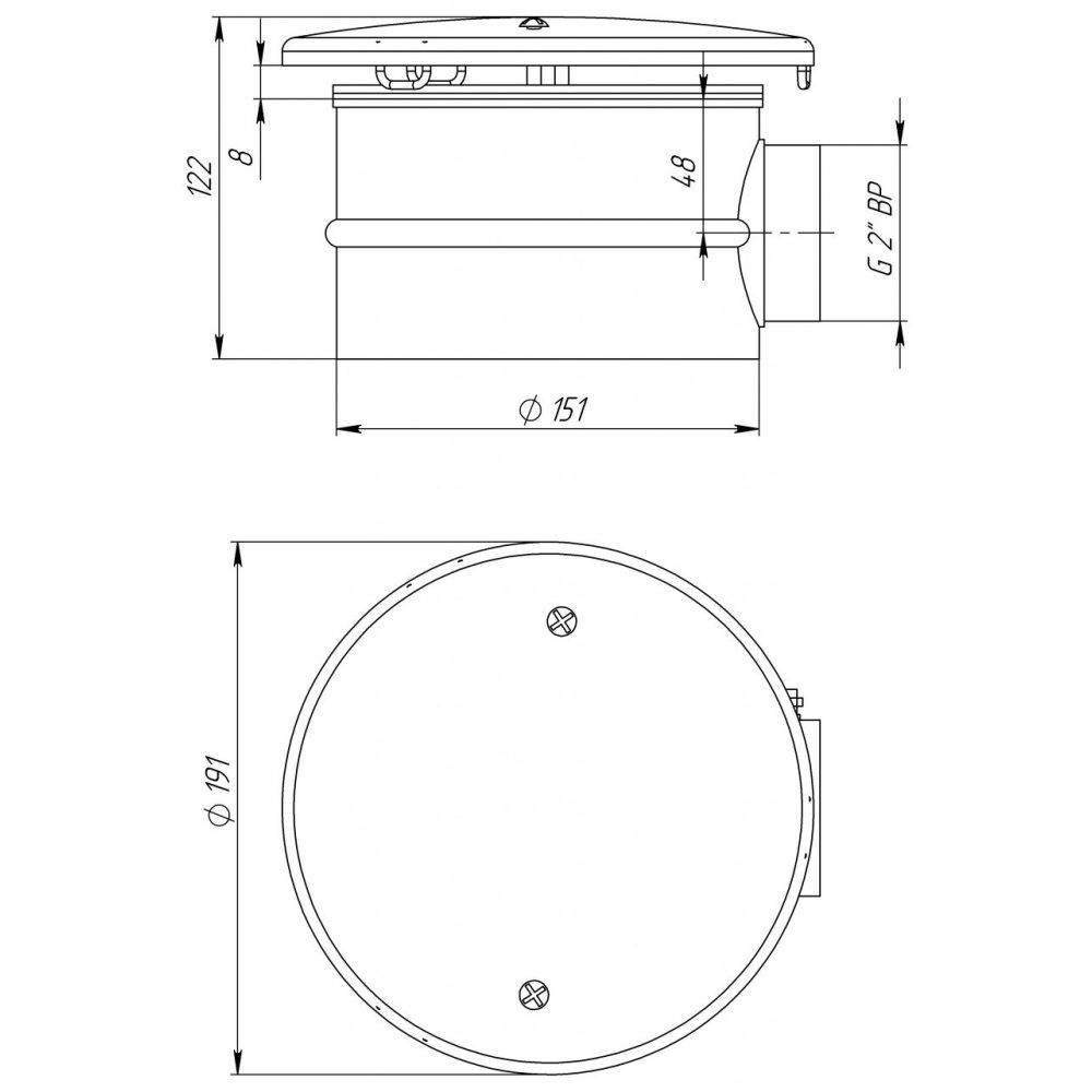 Присоединение – внутренняя резьба 2″. Комплектуется прижимным фланцем, уплотняющей прокладкой и винтами. Антивихревая крышка препятствует образованию воронки.