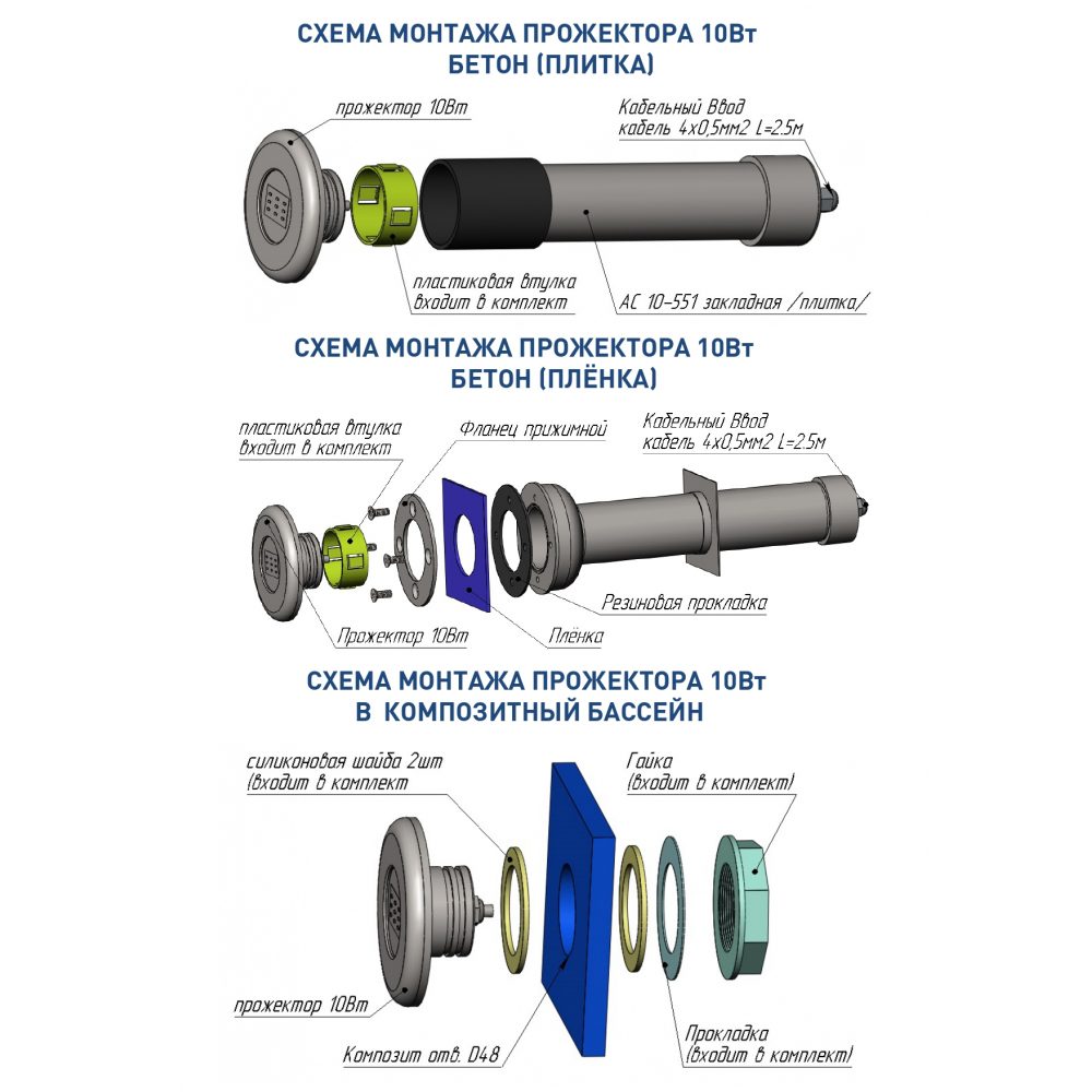 Корпус прожектора выполнен из полированной нержавеющей стали марки AISI 316L. Мощность 10Вт. Для подключения используется постоянный ток 12В
