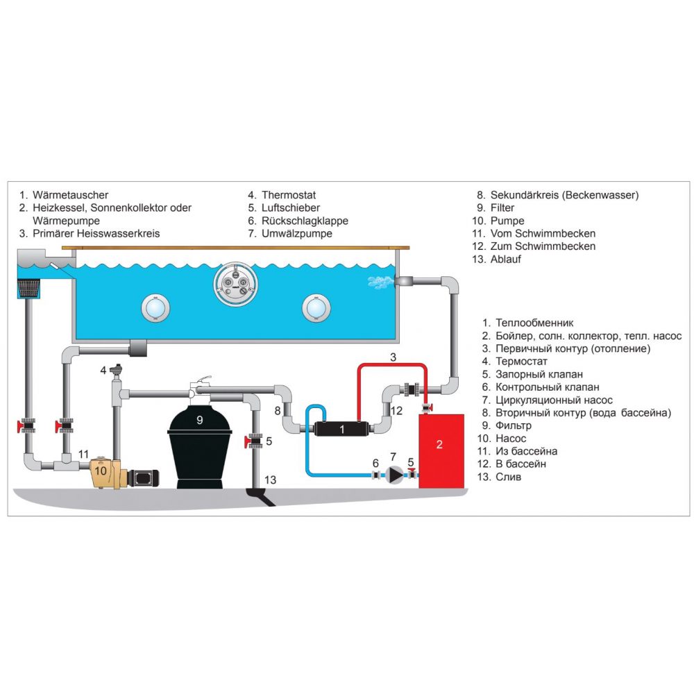 вторичный контур (бассейновая вода) – 8 бар,
