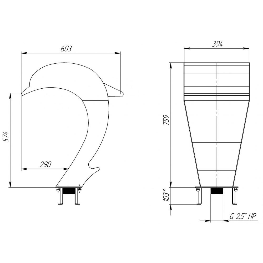 Водопад “Дельфин Бэби”, выполненный из нержавеющей полированной стали, является декоративным элементом. Вода с помощью насоса забирается из бассейна, далее подается по трубам на водопад и через сопла различной формы достигается большой напор струи.